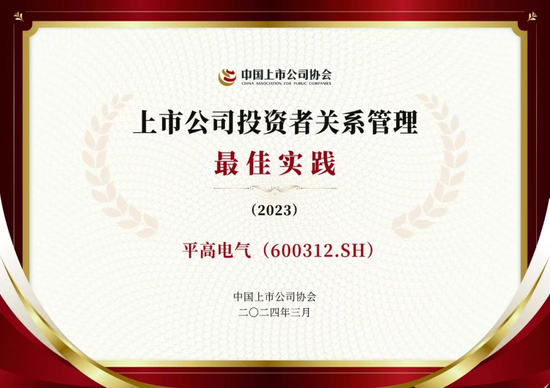 良好、高效的投資者關(guān)系管理有利于提高公司的社會(huì)形象,助力公司實(shí)現(xiàn)價(jià)值傳遞和價(jià)值發(fā)現(xiàn)。為助力上市公司提升投資者關(guān)系管理工作水平,中國(guó)上市公司協(xié)會(huì)于2023年度首次開展“上市公司投資者關(guān)系管理最佳實(shí)踐”活動(dòng)。近日,該活動(dòng)評(píng)選結(jié)果揭曉,平高電氣榮獲2023年度“投資者關(guān)系管理最佳實(shí)踐”榮譽(yù)。在滬深兩市5000余家上市公司中,僅有96家上市公司榮獲上述榮譽(yù)。